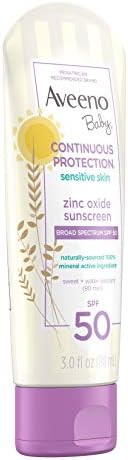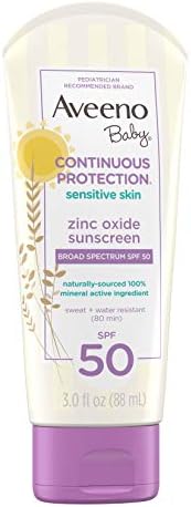 An effective baby mineral sunscreen that's as mild as water to skin. Aveeno Baby Continuous Protection Sensitive Skin Mineral Sunscreen Lotion with Broad Spectrum SPF 50 contains skin-soothing oat and naturally-sourced 100% zinc oxide active ingredient. The mineral sunscreen for babies provides superior broad spectrum protection from UVA/UVB rays and is both sweat- and water-resistant for 80 minutes. From the pediatrician-recommended brand, this hypoallergenic baby sunscreen lotion is designed for baby's sensitive skin and applies easily to lock in moisture without stinging. Designed for sensitive skin, the tear-free formula is non-greasy and is free of parabens, phthalates and fragrance. This baby mineral sunscreen has been awarded the National Eczema Association Seal of Acceptance and is recommended by the Skin Cancer Foundation as an effective broad spectrum sunscreen. It comes in a convenient TSA travel-friendly size for on-the-go and is suitable for use on the face and body.