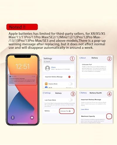 (1) Due to iOS system limitations, oem batteries cannot display the battery status, but will display: Unknown Parts. The pop-up warning message in the notification bar show around 7-15 days (very few mobile phones need longer), but it does not affect the normal use of the mobile phone.