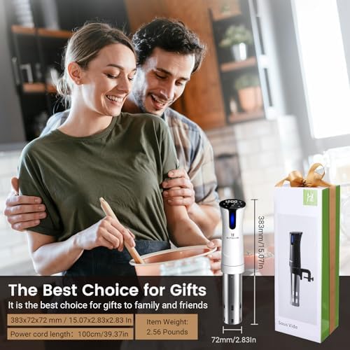 Wattage 1100 watts Voltage 110-120Volts Control Method Touch Capacity 4-15L Temperature Range 77.0~198.5℉(25.0~92.5℃) Temp accuracy ±0.1℃(1°F ) Timer 0-100 Hours Noise level ≤15dB Flow rate 12Liters/min Continuous working duration Up to 10000 hours Clamps Adjustable and Removable Material 304 Stainless Steel + PC Power cord length 100cm/39.37in Product Dimensions 383x72x72mm/15.07x2.83x2.83in Package Dimensions 430×115×150mm/16.92x4.52x5.9in Package List 1x Sous Vide Cooker; 1x User Manual; 1x Spiral Clamp; 1x Recipes