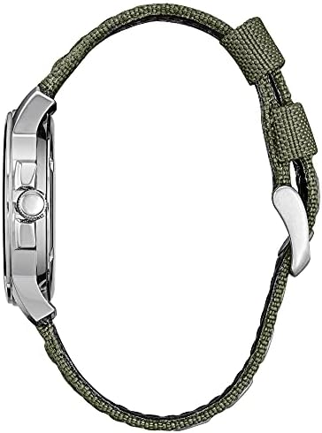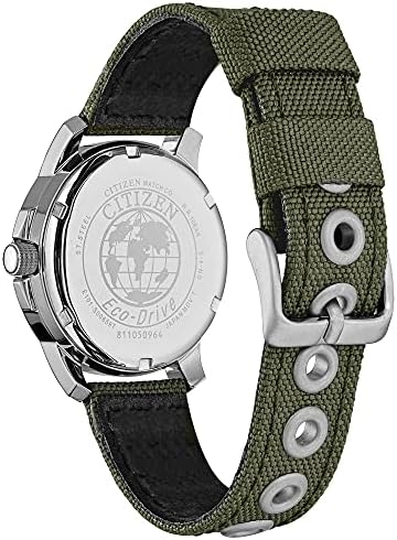 For a rugged look with a comfortable fit, this military-inspired timepiece fits the bill. with a day-date indicator, luminous hands, 37mm screw-back case, and 100M WR. The black dial provides a backdrop for simple Arabic numerals, housed in a stainless steel case along with a woven green strap with patterned stitching and a buckle clasp. Featuring our Eco-Drive technology – powered by light, any light. Never needs a battery. Caliber number E100.
