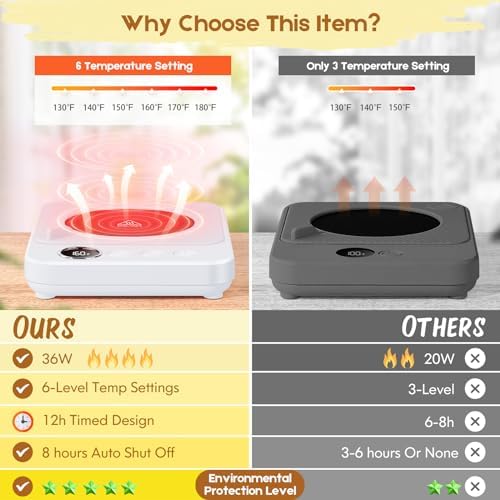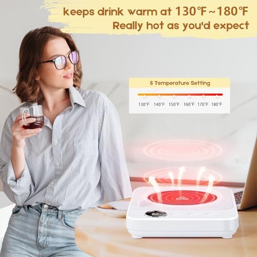 This works really well at keeping cups of liquids warm/hot at the temperature you select. It also will quickly heat water in a cup or bowl when you need a little hot (but not boiling) water/liquid for something. The temp setting goes from 130 to 180 degrees. I have even warmed up leftovers from the fridge on it. Was surprised at how fast the food in a small plate/bowl heated up. My microwave bit the dust so this comes in handy in a pinch. The auto shut-off feature is nice as well. I'm really glad I bought this.