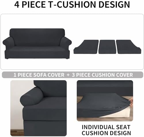 A great couch cover. Fits well, and looks good. I really like the individualcushion covers. The straps in them made a good fit. No saggy cushions. The material is soft and love the dark gray color. I also like the way it completely covers the whole couch, even the arms fit well under it. Keeps cat from scratching it, no open spaces.Keeps couch well protected,and fit is incredible.I highly recommendthis cover.