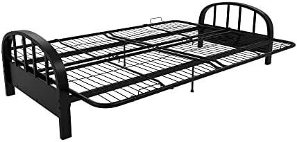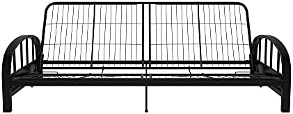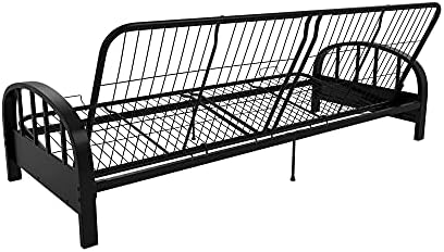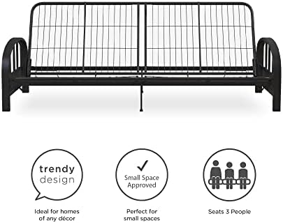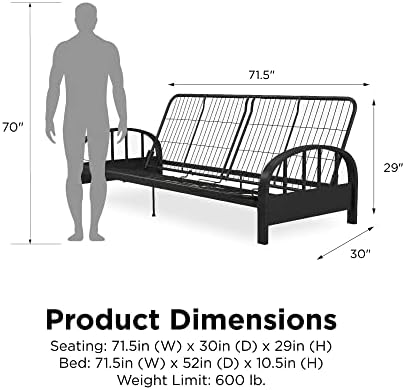 Enhance your living area with the DHP Aiden Metal Futon Frame in Black. This modern design features a contemporary low seating design that complements any décor. The sturdy metal frame construction guarantees optimal support and durability, accommodating a standard size futon mattress (sold separately). The 3-in-1 design allows for easy conversion from a sofa to a lounger, to a full-size bed, with retainer clips to prevent the mattress from sliding. The futon dimensions are 76.5"L x 30"W x 29"H, with a bed size of 71.5"L x 52"W x 10.5"H and a weight limit of 600 pounds. The DHP Aiden Futon Frame is easy to assemble, shipping in one box for stress-free handling. Complete the look with a 6" premier or 8" deluxe futon mattress in black, brown, or tan (sold separately). Whether used as a sofa or a bed, this frame is the ultimate in functionality for your home furniture and furnishings. Add versatility and style to your space with the DHP Aiden Metal Futon Frame.