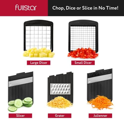 The Fullstar All-in-1 Vegetable Chopper, Mandoline Slicer & Cheese Grater is a game-changing tool that will revolutionize your kitchen experience. This versatile gadget combines multiple functions into one compact and efficient device, making meal prep a breeze.What sets this kitchen tool apart is its unparalleled versatility. With interchangeable blades and attachments, you can effortlessly chop, slice, and grate a variety of fruits, vegetables, and cheeses with precision and ease. From perfectly diced onions to uniformly sliced cucumbers, this chopper delivers professional-quality results in seconds.I particularly appreciate the safety features of the Fullstar All-in-1 Vegetable Chopper. The included handguard ensures your fingers stay safe while slicing and dicing, giving you peace of mind during food preparation. Plus, the non-slip base keeps the chopper securely in place on your countertop, preventing accidents and spills.Cleanup is a breeze with this kitchen tool. All components are dishwasher safe, making it easy to maintain hygiene and cleanliness after use. The compact design also makes storage a breeze, taking up minimal space in your kitchen cabinet or drawer.Whether you're a seasoned chef or a beginner in the kitchen, the Fullstar All-in-1 Vegetable Chopper is sure to become your go-to tool for effortless food preparation. Say goodbye to tedious chopping and slicing and hello to quick, easy, and delicious meals every time!Unfortunately, it is not perfect, sometimes food get stuck in the blades and are hard to clean!