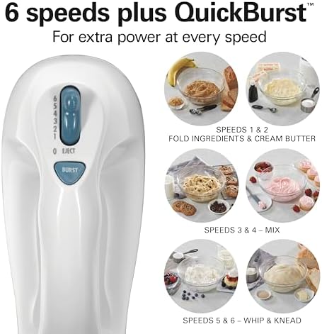 It features 6 speeds to tackle every mixing job, and the QuickBurst button provides extra power at every speed. You can easily mix, beat and whip all your favorite recipes, from classic chocolate chip cookies to meringue-topped pie, and the 250 watt peak-power motor provides all the power you need.