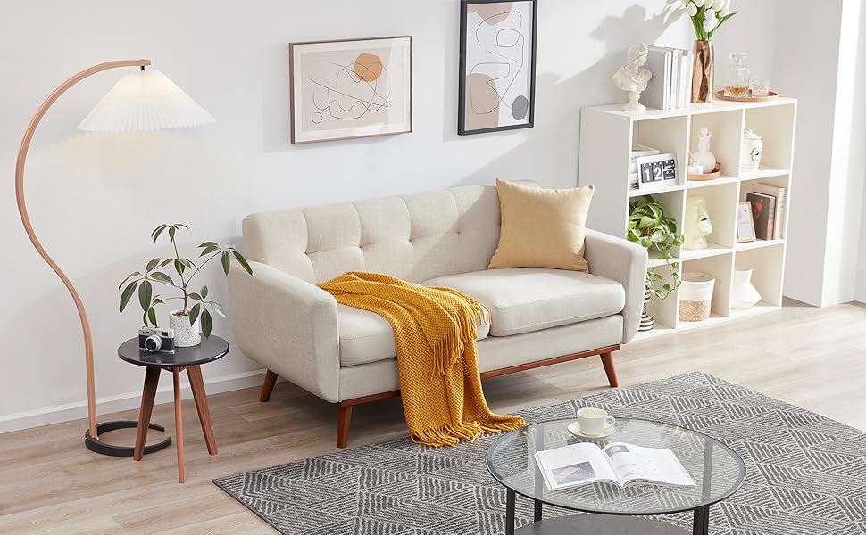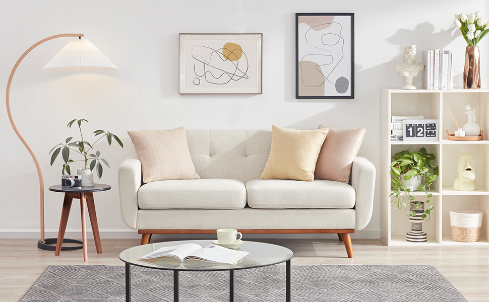 I recently bought this loveseat and I'm really happy with it. It fits perfectly in my living room and complements my decor very nicely.One thing I appreciate about it is the design; the white/beige color scheme is simple yet elegant. It's versatile and goes well with various styles.Comfort-wise, it's surprisingly very good. The cushions are comfortable without being too soft, and it's become my favorite spot for relaxing in the evenings.The build quality seems decent. It feels sturdy and well put together, and I hope it will last a while. Cleaning the fabric is easy, which is a practical feature.Assembling it wasn't too complicated either, the instructions were clear.Overall, I'm satisfied with this purchase. It's a good addition to my living space, both in terms of style and comfort. If you're looking for a reasonably priced love seat, this one is worth considering.