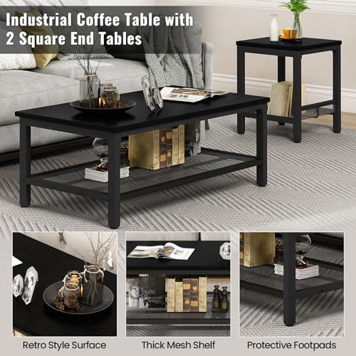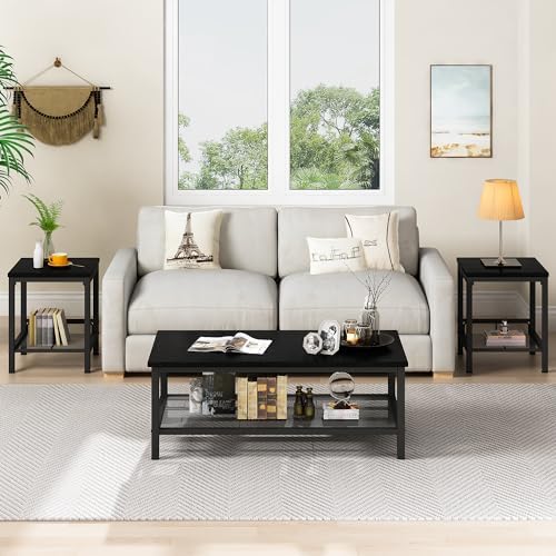 Material: MDF, Metal Coffee Table Size: 41.3"L x 23.6"W x 17.9"H Coffee Table Weight: 13.51lbs Color: Black End Table Size: 17.7" L x 17.7" W x 21.7" H End Table Weight: 6.02lbs