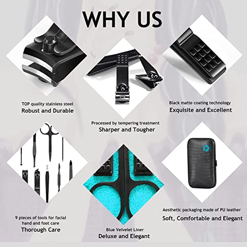HANTEKAS Professional Manicure Kit Contains 9 pieces nail and toenail tools for three functions must meet what you need, include hand care,facial care,foot care: Nail clippers for finger and toenails, cuticle pusher cleaner, nail file, v-shaped push stick cuticle trimmers, eyebrow tweezers, multi-purpose scissor, blackhead needle with loop remover and ear pick.