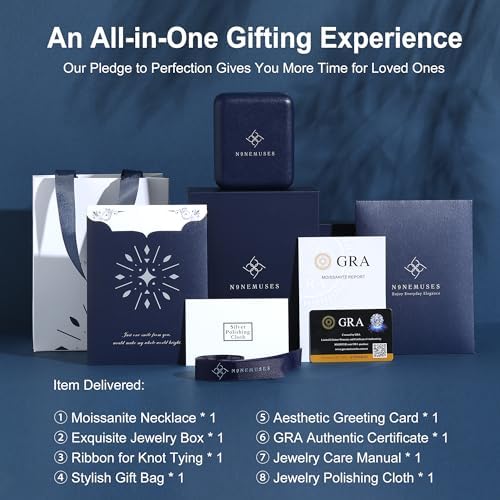 Brand, Seller, or Collection Name N9NEMUSES Material 18K White Gold Gem Type Moissanite Setting Prong Item Length 1.38 inches Chain Cable Clasp Spring Ring Number of stones 12 Stone Weight 5.00 carats Model number 9M-NC-MS-SMILE-5CT Certificate number Exclusive Certificate type GRA