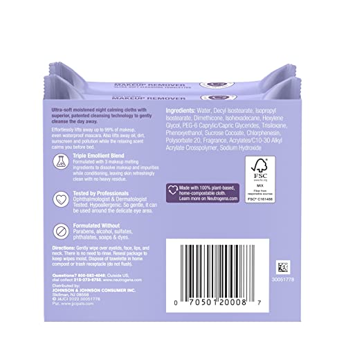 Gently remove makeup & cleanse the day away with Neutrogena Makeup Remover Night Calming Cleansing Face Wipes with a relaxing scent. The nighttime facial cleansing towelettes gently dissolve up to 99% of makeup, even waterproof mascara. Plus, these face wipes lift away oil, dirt, sunscreen & pollution while the relaxing scent calms you before bed. The patented cleansing technology of these pre-moistened facial cleansing towelettes with a triple emollient blend melts away makeup & leaves skin refreshingly clean with no heavy residue. Ophthalmologist and dermatologist tested, these hypoallergenic cleansing cloths are formulated without of parabens, alcohol, sulfates, phthalates, soaps & dyes & are gentle enough even for the delicate eye area.