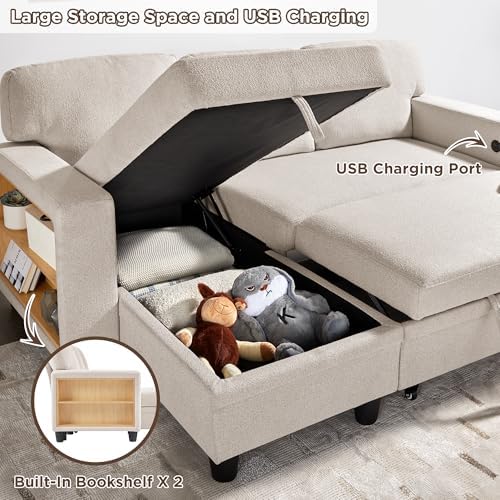 RedLemon 80”Sleeper Sofa Bed,L-Shaped Convertible Sectional Couch Bed with Storage Chaise,2 Built-in Bookshelves and USB Charging Port - Beige