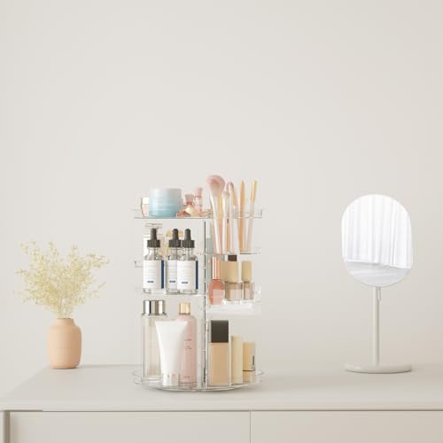 Rotating Makeup Organizer, DIY 8 Adjustable Layers Spinning Skincare Organizer, Cosmetic Display Case with Brush Holder Perfume Tray, Multi-Function Storage Carousel for Vanity Bathroom Countertop