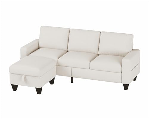 This small sofa of Woyomeub is perfect for living room, apartment, dorm and other small rooms where space is limited. Measuring 78" x 29" x 33", this sectional couches provides you with seating space for 3 people. Thoughtfull ideals of storage on ottoman and side bags provide storage space for small blankets, games, small toys, and other small items. Provides you with additional seating space while providing some space for organizing. Specification: Product: Sectional sofa Dimension: 78×29×33 inches / 198×73.5×82 cm Weight: 105 lbs Seating Capacity: 3 seater sofa Fabric: Linen; Velvet Color: Beige, Grey Cushion: Detachable Padding: Foam; Fibre Storage: Yes Sofa Cover: Zipped, detachable