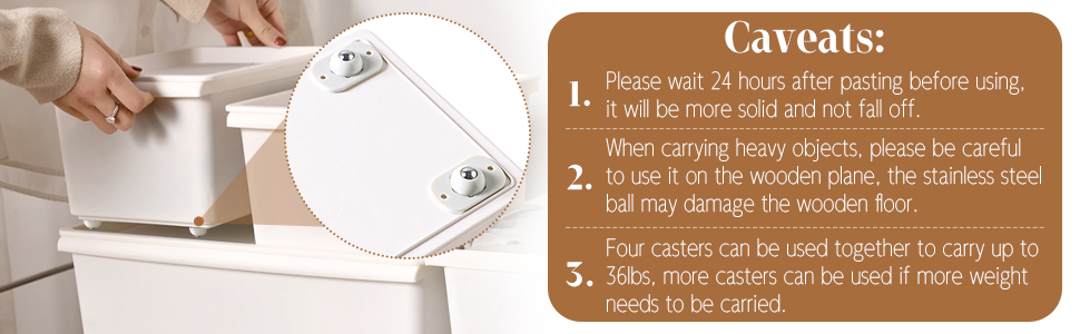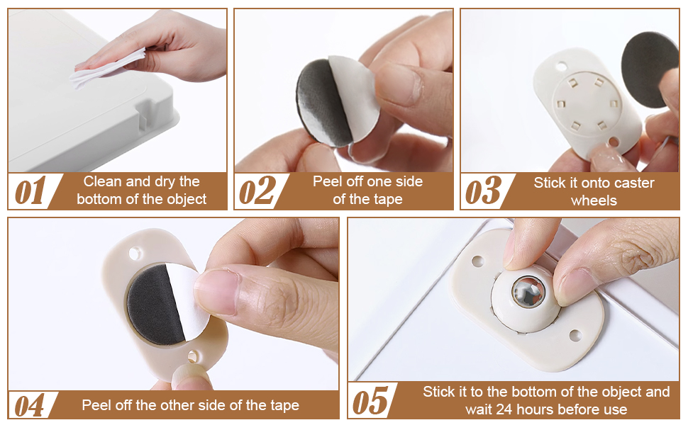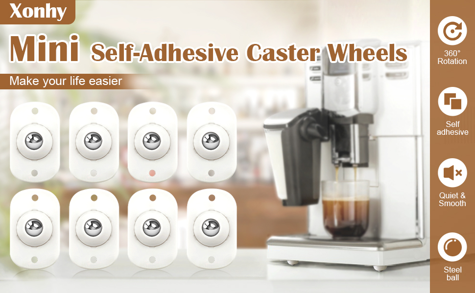 These self adhesive caster wheels saved my from having to buy a new coffee pot.The steam on my coffee pot was ruining the bottom of my upper counter cabinet.Now with the casters I just slide it out, make the coffee and slide it back. Works great.