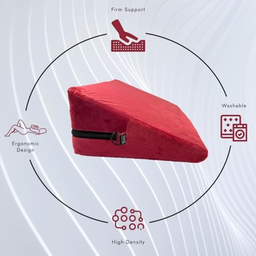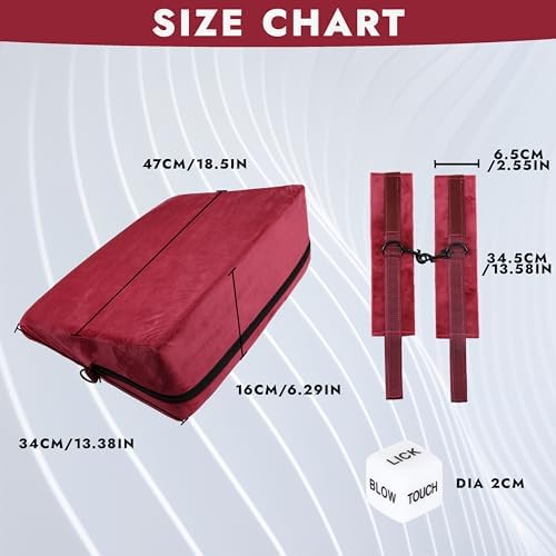 This wedge pillow cushion with handcuffs and fun game cubes are a cool way to spice up my life. The wedge pillow material has very soft velvety feeling. The pillow took about 24 hours to fully expand as it was vacuum packed from the factory. I was surprised to see that the foam inside the pillow was harder than I expected. However, when used that actually turned out to be a good thing as it is holding up body parts where they need to be.