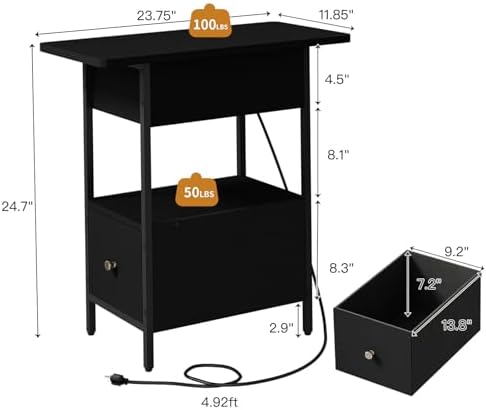 Very nice narrow end table and good quality. Half of the top opens for storage and the outlets and USB ports are very convenient. The cloth drawer slides out for storage too. Perfect size for a small space.