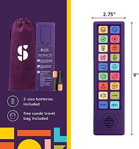 Talker Buddy by Special Supplies is an advanced AAC (augmentative and alternative communication) device that is designed to help non-verbal individuals to communicate effectively, regardless of their language or cognitive abilities. The device comes with a wide range of pre-installed vocabulary, including common phrases, words, and sentences, that can be used in different situations. Additionally, the device has the option to record and add your own words and recordings, allowing users to customize the device to their specific needs, providing a more personalized and effective communication experience. The device comes with a soft touch interface that is easy to navigate and operate, making it accessible for individuals with autism, stroke, or other special needs, both children and adults. The device also comes with a travel bag, making it easy to take on the go for therapy sessions, home-schooling, traveling, or other activities. It's also suitable for use in hospitals, providing a valuable communication tool for patients who are unable to speak. The device is designed to be used by speech therapists, hospital staff, and other professionals, as well as by parents and caregivers of non-verbal children and adults. Talker Buddy is a powerful communication tool that can help individuals with communication difficulties express themselves and improve their speech, providing them with greater autonomy and independence in different settings and environments. Help them Talk & Communicate with our Talker Buddy AAC speech communicator!