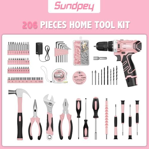 Sundpey Home Tool Kit with Drill - 206PCs Pink Tool Kit with 12V Cordless Power Drill for Household Repair - Portable Basic Pink Tool Box for Women with DIY Hand Tool Set(Screwdriver Set & Pliers Set)