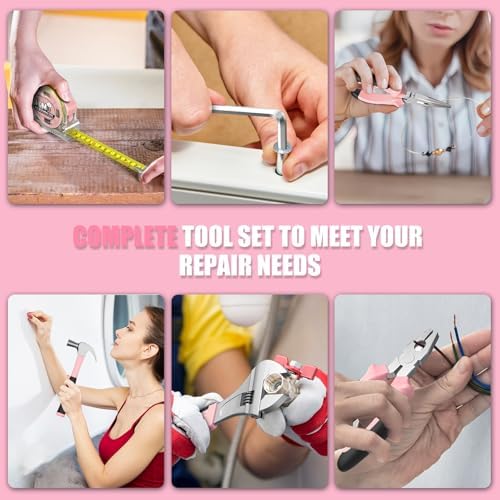 This pink tool kit for women including: various materials and sizes of drill bits, screwdriver bits, 1/4 socket, 200mm flexible shaft and so on. Good for families who have just moved or daily home assembly and repair.