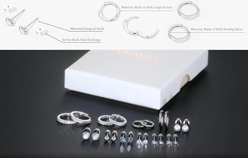 11 Pairs Surgical Steel Flat Back Studs and Sterling Silver Huggie Hoops