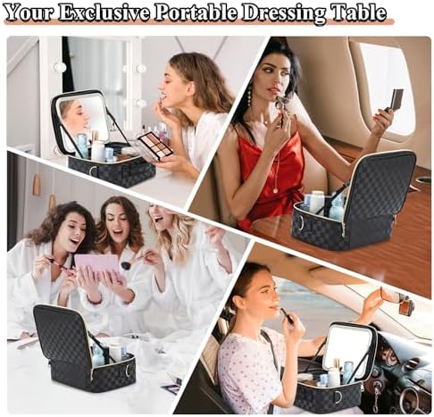 Travel Makeup Bag With LED Mirror, Cosmetic Train Case with Light up Mirror, Portable Makeup Artist Organizer Bag with Adjustable Dividers, Makeup Brush Holder Storage, Black