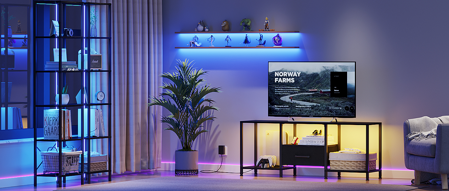 Color Rustic Brown Material Particleboard, Steel Product Size 46.1"W x 11.4"D x 19"H Product Weight 18 lb Package includes 1 x LED TV Stand, 1 x Assembly Kit, 1 x Anti-Tip Kit, 1 x Instructions