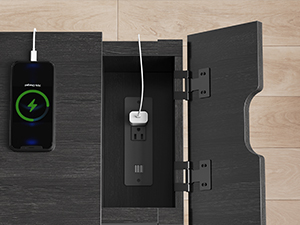 Hidden in the flip-up compartment, the charging station lets you stow away plugs and cords for a neat tabletop.