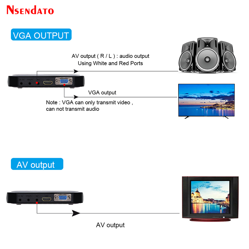 There are AV, HDMI, YPrPb and VGA interfaces for video output.