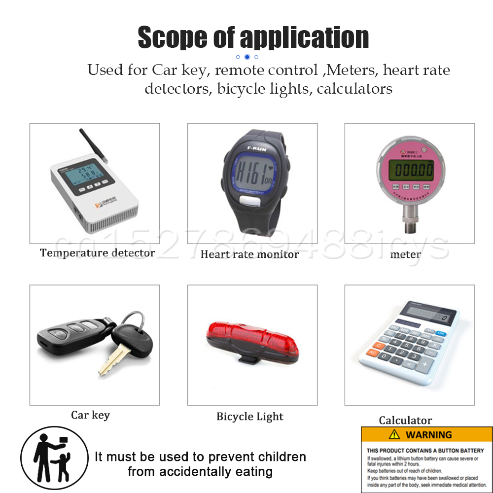 Used for toy, calculator, laser pointer, computer motherboard, e-dictionary, watch, electronic scale, cardiac pacemaker, electronic hearing aid, counter, clock, watch, game, digital camera, camcorder, PDA, MP3 player, remote control, electronic instrument, voice recorder, blood glucose meter, cholesterol testing meter, LED light ect