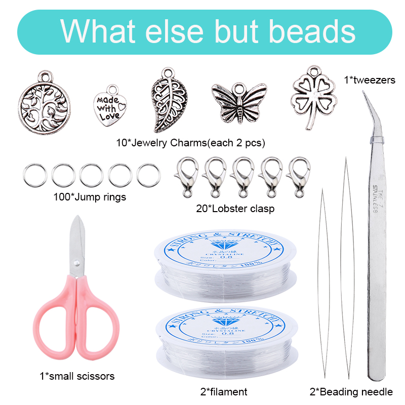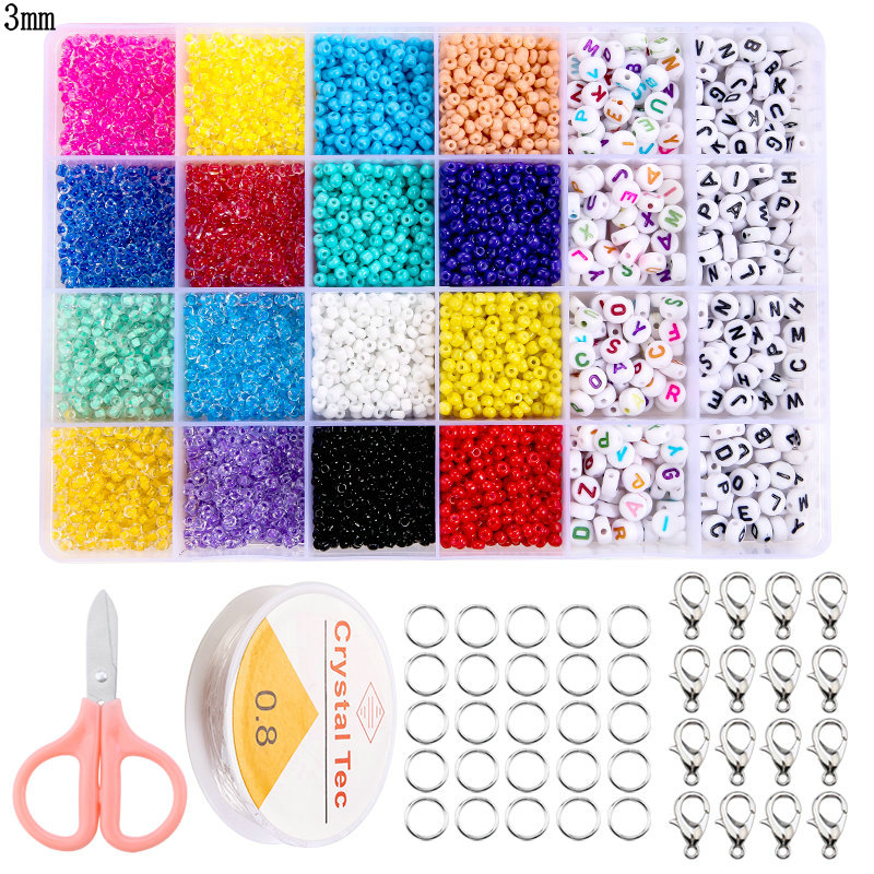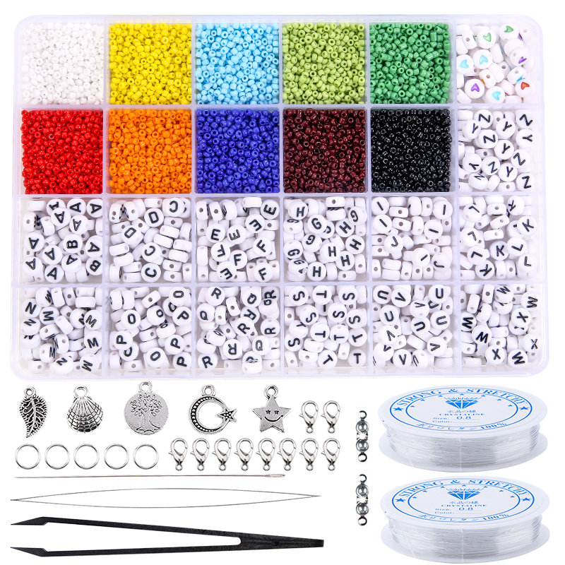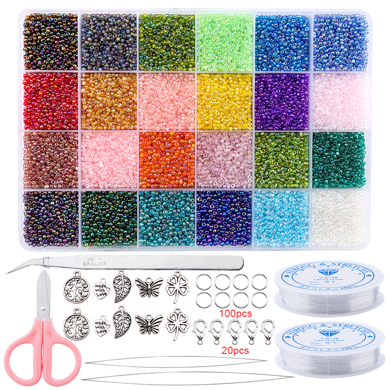 Glass beads set include 20000 pcs 2mm various colors seed beads with storage box, 2 rolls clear elastic thread, 100 pcs jump rings, 20 pcs claw clasps, 1 pcs scissors,2 pcs needles,1 pcs tweezer.