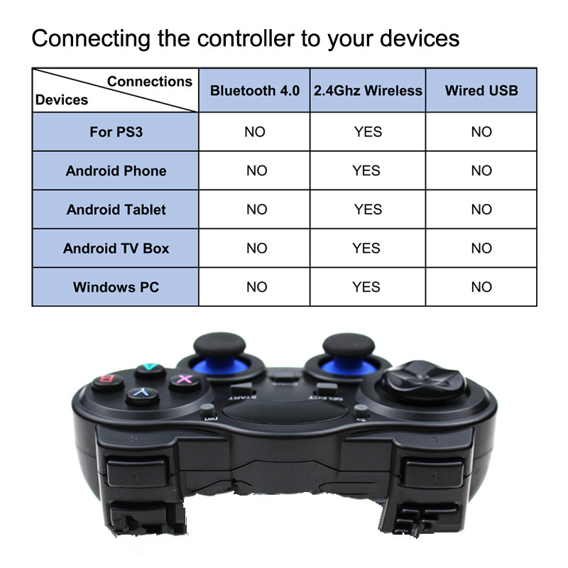 1. 2.4G wireless gamepad, no Bluetooth-compatible. Compatible with PC, Android Mobile Phone, Android Pad, TV Box, Smart TV, PS3 console. Super X pro console...