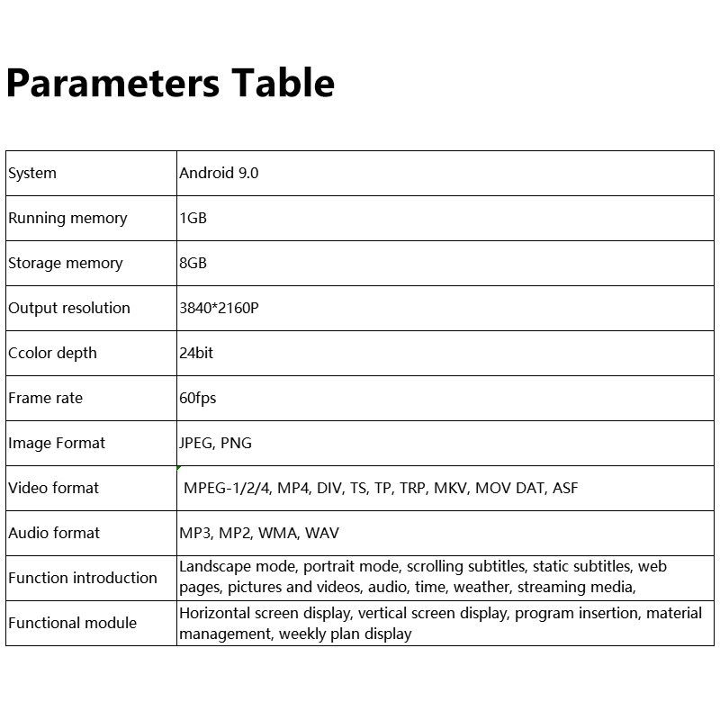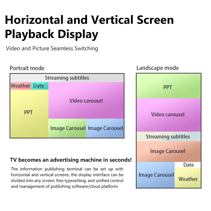 Landscape mode, portrait mode, scrolling subtitles, static subtitles, web pages, pictures and videos, audio, time, weather, streaming media, background pictures, OFFICE, etc.