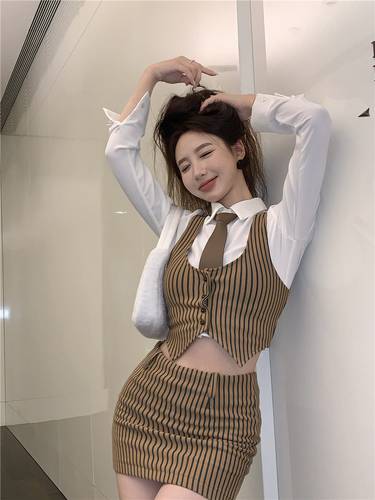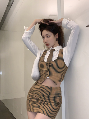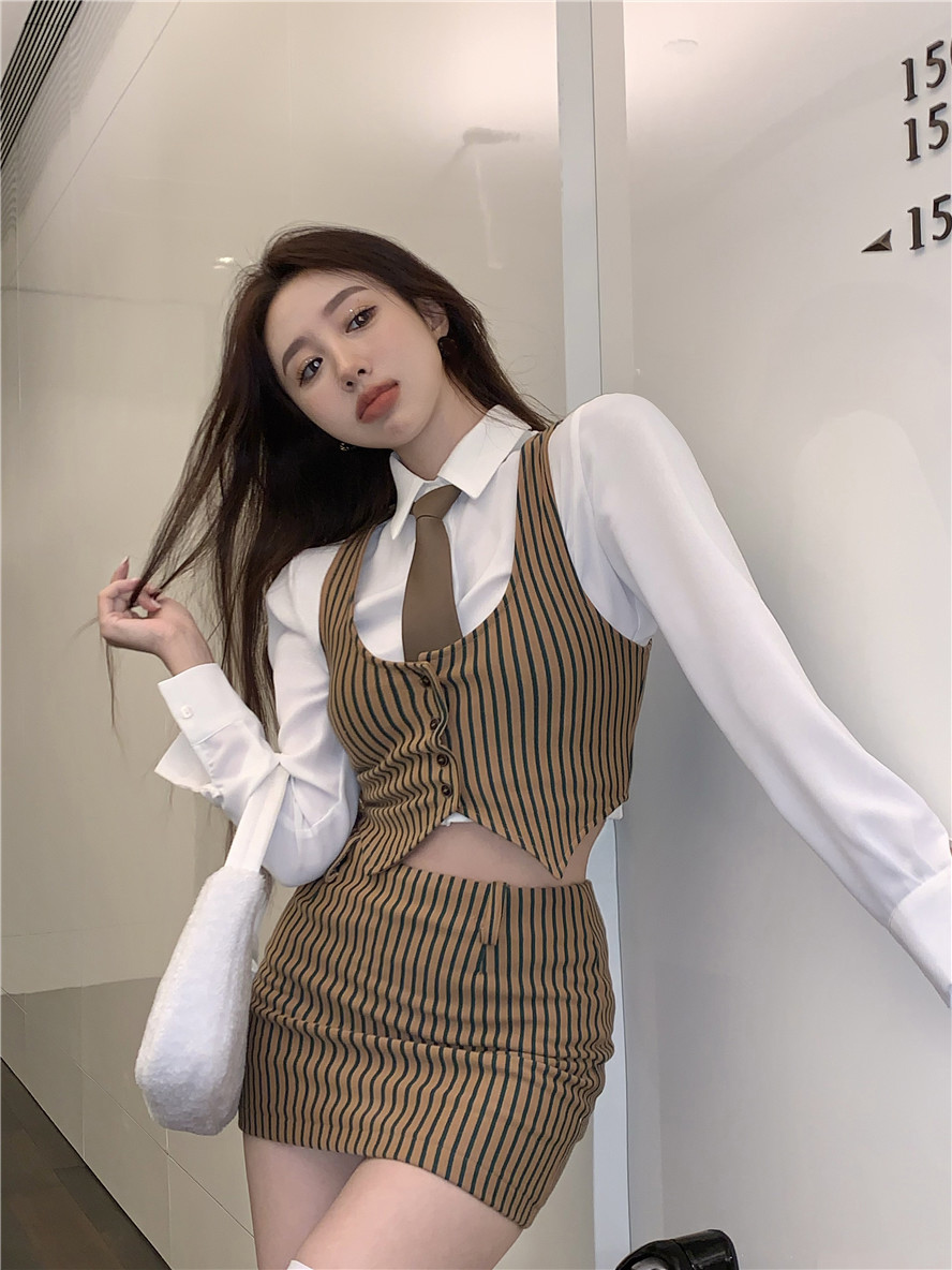 American Retro 3pcs Suit Women V-neck Button Up Vest + Shirt Tie + Mini Skirt Spring Girl Knitted
