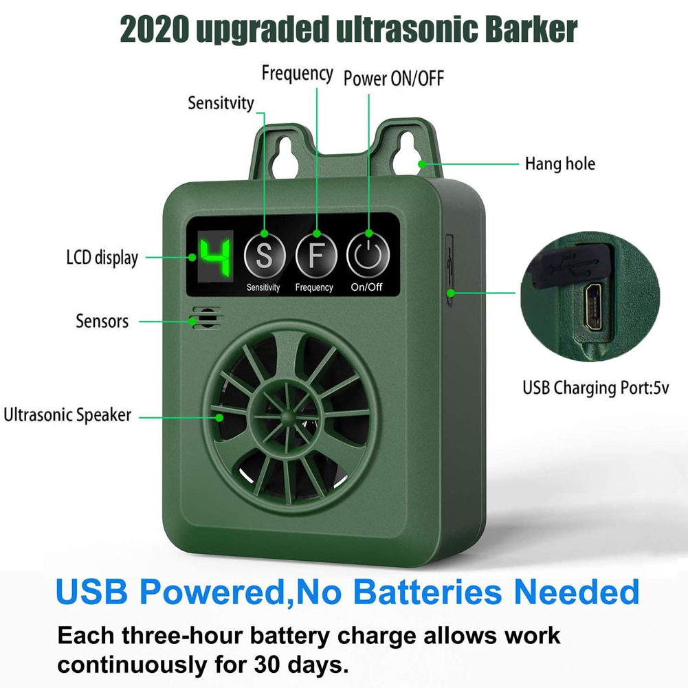 Bark-proof controller has a carefully designed mini-shape, which can be hung on trees, indoors, outdoor walls or fence posts to prevent any dog barking (within range), It can be used safely indoors and outdoors in any weather conditions.