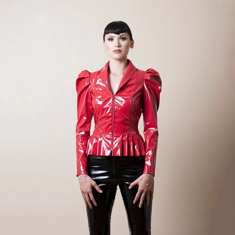 Gothic Long Sleeves Leather Jacket Jacket For Women Lapel Neck Coat Hem Ruffle Ladies Faux Latex Slim Puff Sleeves Jacket Custom