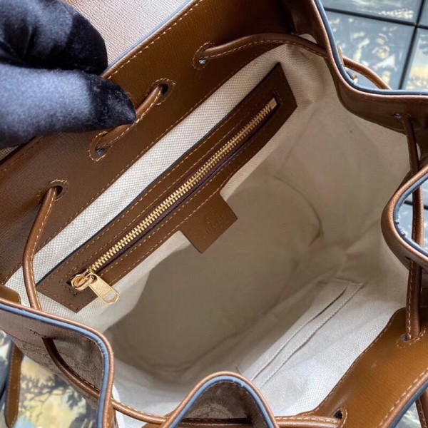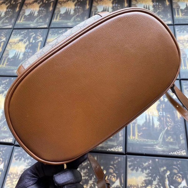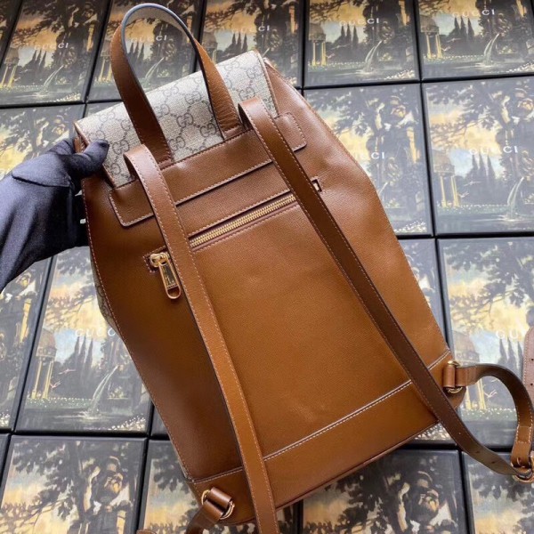 Inspired by the archival details found throughout the Gucci 1955 Horsebit line, the backpack presents a contemporary mix of the original elements with a modern spirit. Crafted from GG Supreme canvas and leather, with a drawstring and flap closure, the silhouette is completed with adjustable leather straps and a front zippered pouch, highlighting the double ring and bar design.