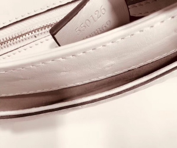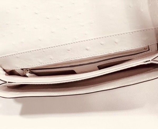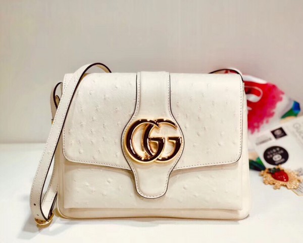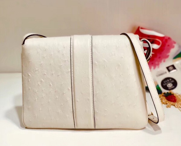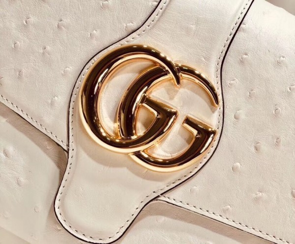 Brought back from the 1970s archives, the Double G hardware enhances the front of a medium shoulder bag in ivory ostrich, designed with double gussets and an exaggerated flap. The retro inspired silhouette was first presented in the Cruise 2019 fashion show, revealed in the evocative setting of the Roman necropolis of Promenade des Alyscamps, in the French town of Arles—which gives the name to the line.
