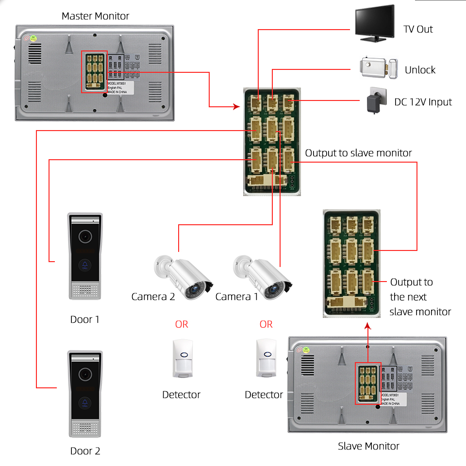 Our Product Just Works Well With Our Own Intercom System. At Present. We Could Not Guarantee It Could Be Compatible With Other Brand Indoor Monitor/Outdoor Camera. If You Need To Connect Other System ,Please Contact Us For Technical Support Before Buying.