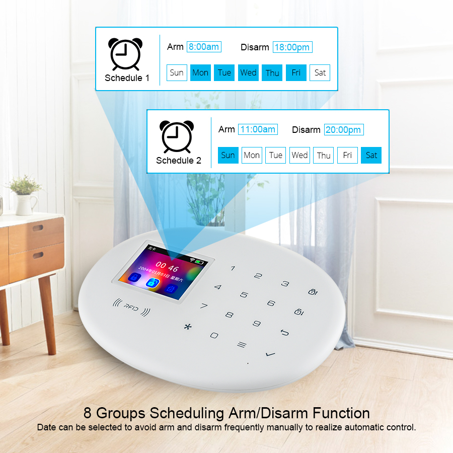 With a free IOS/Android smartphone app, it can be easily controlled by arming, disarming, and home modes with also a simple remote control & RFID Card