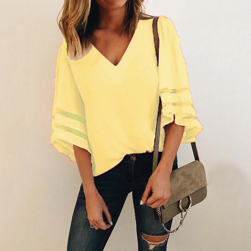 Mesh Stitching Women Chiffon Blouse Shirt Sexy V Neck Casual Loose 3/4 Flare Sleeve Solid Summer Blusas Shirt Summer Female Tops