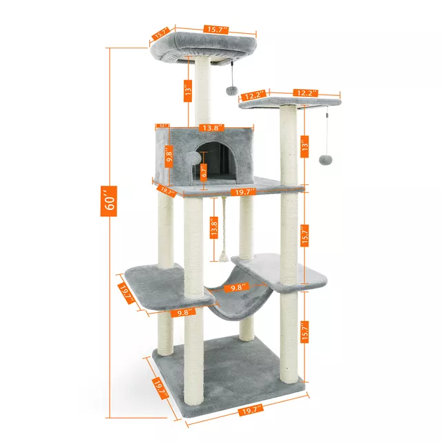 MULTILEVEL FUN: The 5 level platforms design provide different jumping heights for your cats to satisfy their daily exercise. Two roomy condos are super comfortable for your pet to roll, with lateral door and round holes are designed for cats to observe outdoor as well as allowing them to get in and out or jump to the top hammock. A cozy perch on the top not only allow your cat to have a nice rest, but also offer a best spot to enjoy sunshine and outside scenery.
