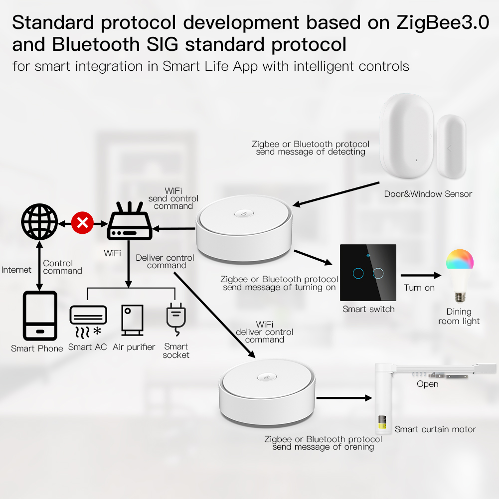 1.Sub-device control as multi-mode compatible:Control sub-devices of the gateway, supporting remote control and group control for connected Bluetooth and ZigBee smart devices in Smart Life App as multi-protocol communication for ZigBee3.0 standard protocol and Bluetooth SIG standard protocol based,ensuring stable control of 128 devices as strong performance.