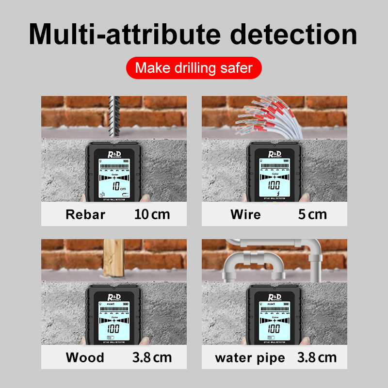 R&D Metal detector apply for detecting metal hidden in walls, ceilings and floors (reinforced steel, copper pipe), cable; wooden beams, metal, electricity under the plasterboard cable. Make the decoration drilling works safer.