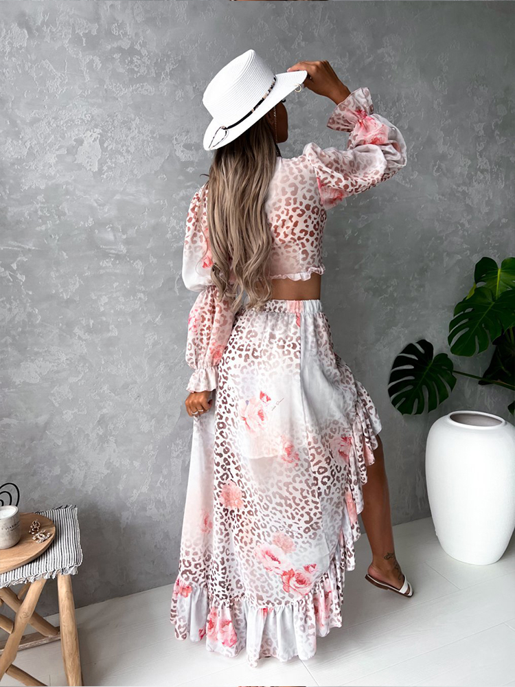 Slim Lady Beach 2 Piece Sets Summer Women Sexy Long Sleeve V-Neck Lace-up Hollow Short Top + Irregular Ruffle Skirt Suit