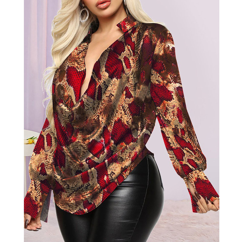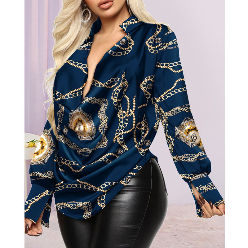 Spring Autumn Women Sexy Deep Cowl Neck Blouse Long Sleeve Casual Vintage Chain Graphic Print Long Sleeve Street Top Female