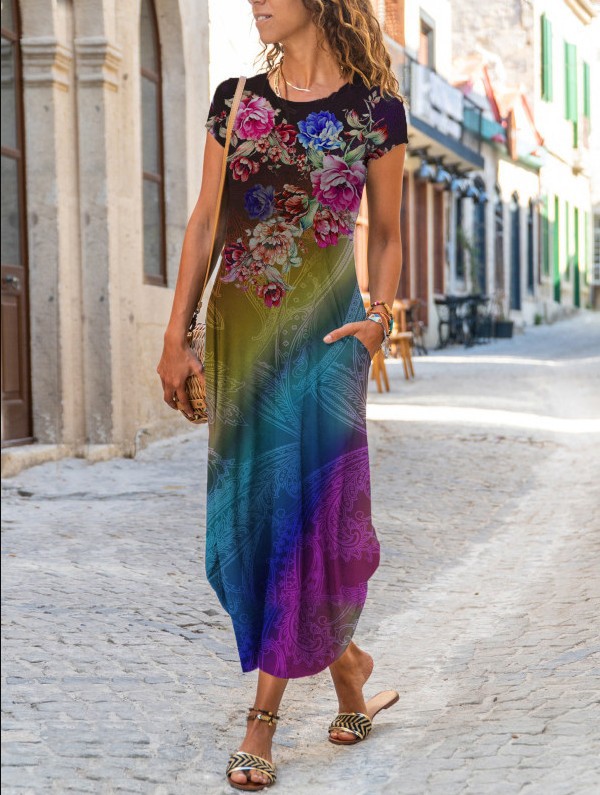 Summer Dress 2022 Woman Plus Size Floral Print Short Sleeve Bohemian Long Dresses Casual Loose O-Neck Slim Sundress Vestidos
