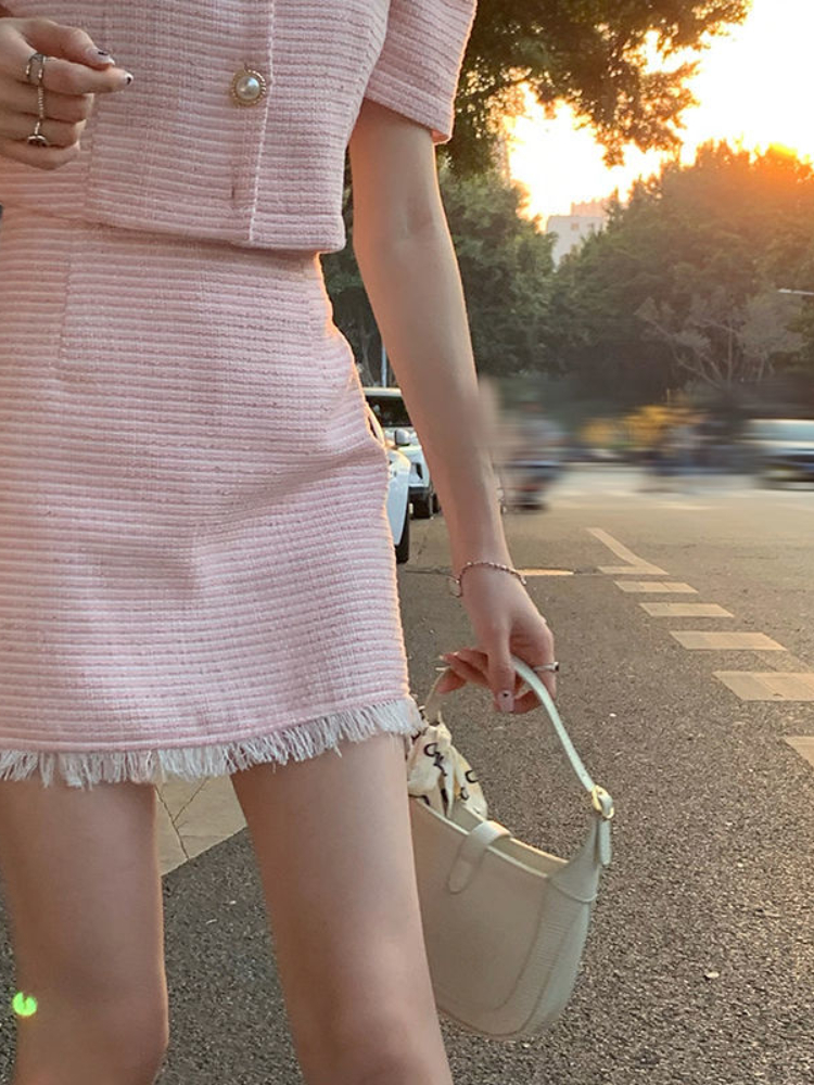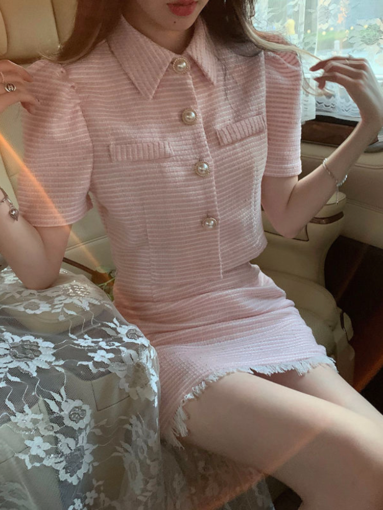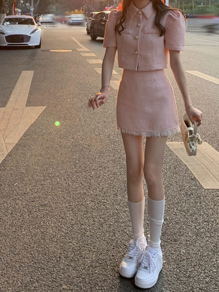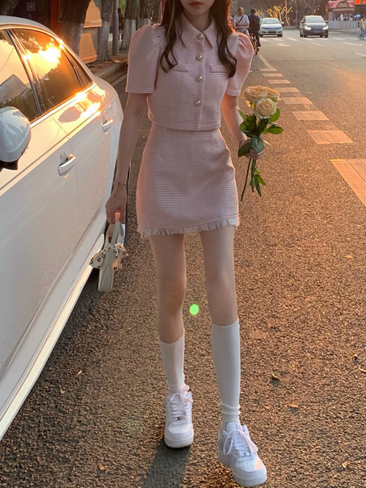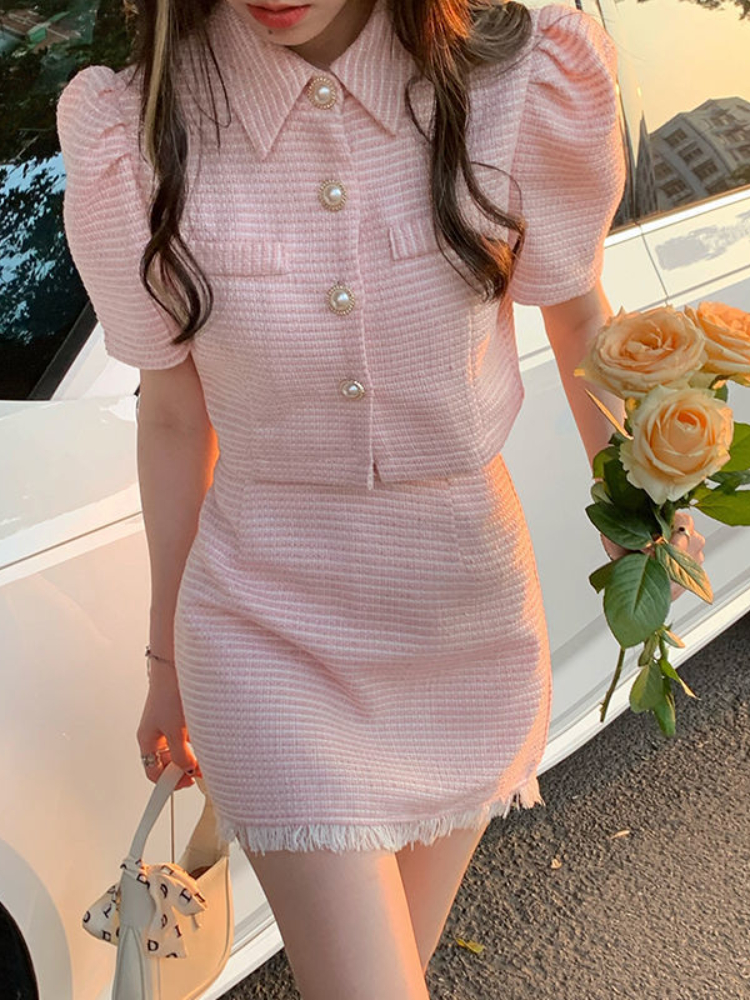 Sweet Temperament Pink Puff Sleeve Lapel Coat Women Single-breasted Short Jacket Summer Mini Skirts Matching Sets Chic