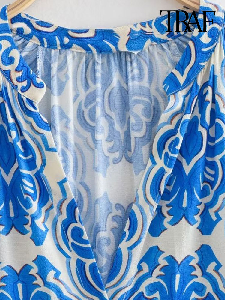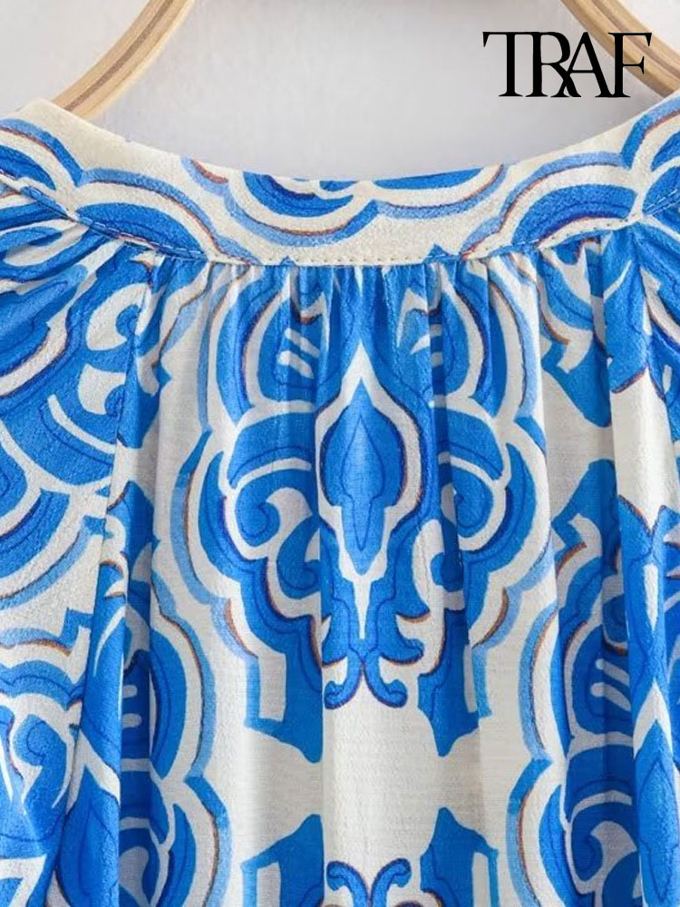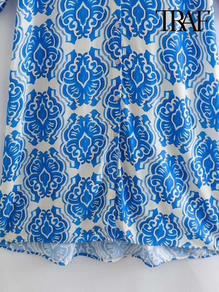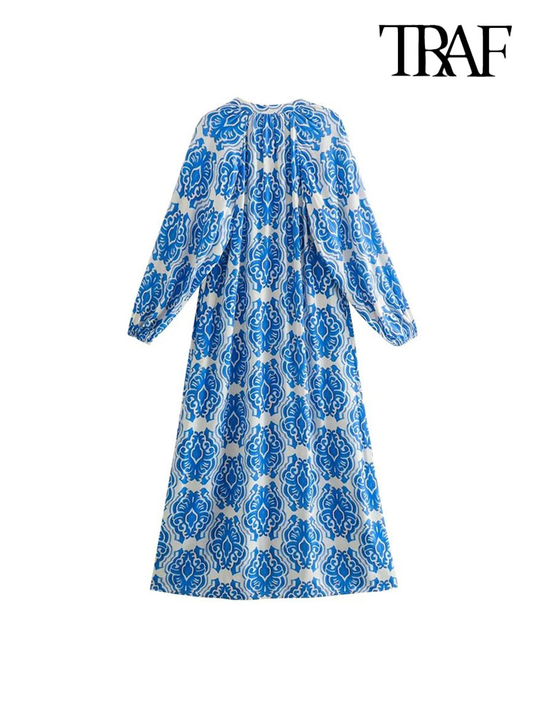 TRAF Women Front Buttons Printed Midi Dress Vintage V Neck Long Lantern Sleeve Female Dresses Vestidos Mujer