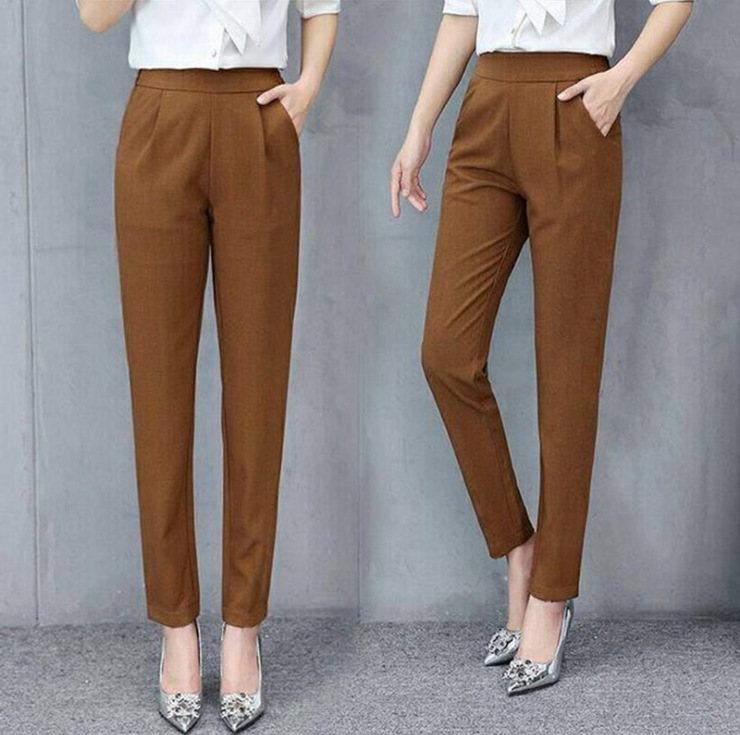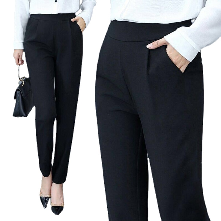 Trouser Suit Office Lady Work Wear Formal Pants Women Fall Slim Elastic Waist Pockets Casual Straight Pencil Cropped Pants Black