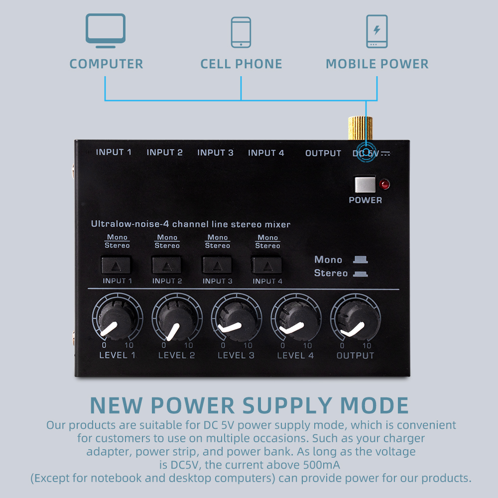 【DC 5V Power Supply】The digital mixer uses the latest DC 5V power supply mode, so it no longer restricts the application scenarios. NOTE: Please use an external power supply with CE or UL certification, and stay away from the interference source, otherwise it will cause noise and other undesirable interference to the product. (Adapter included)